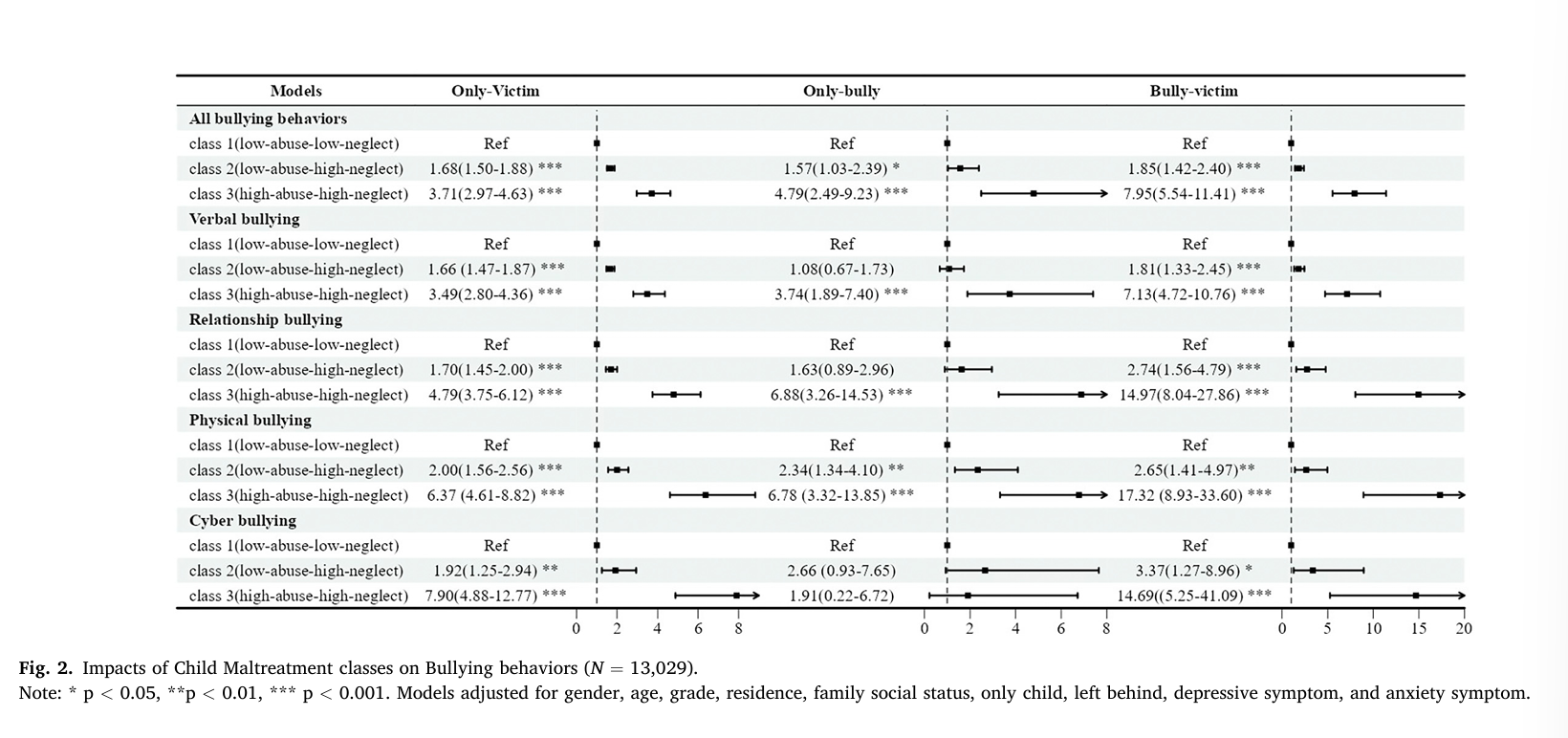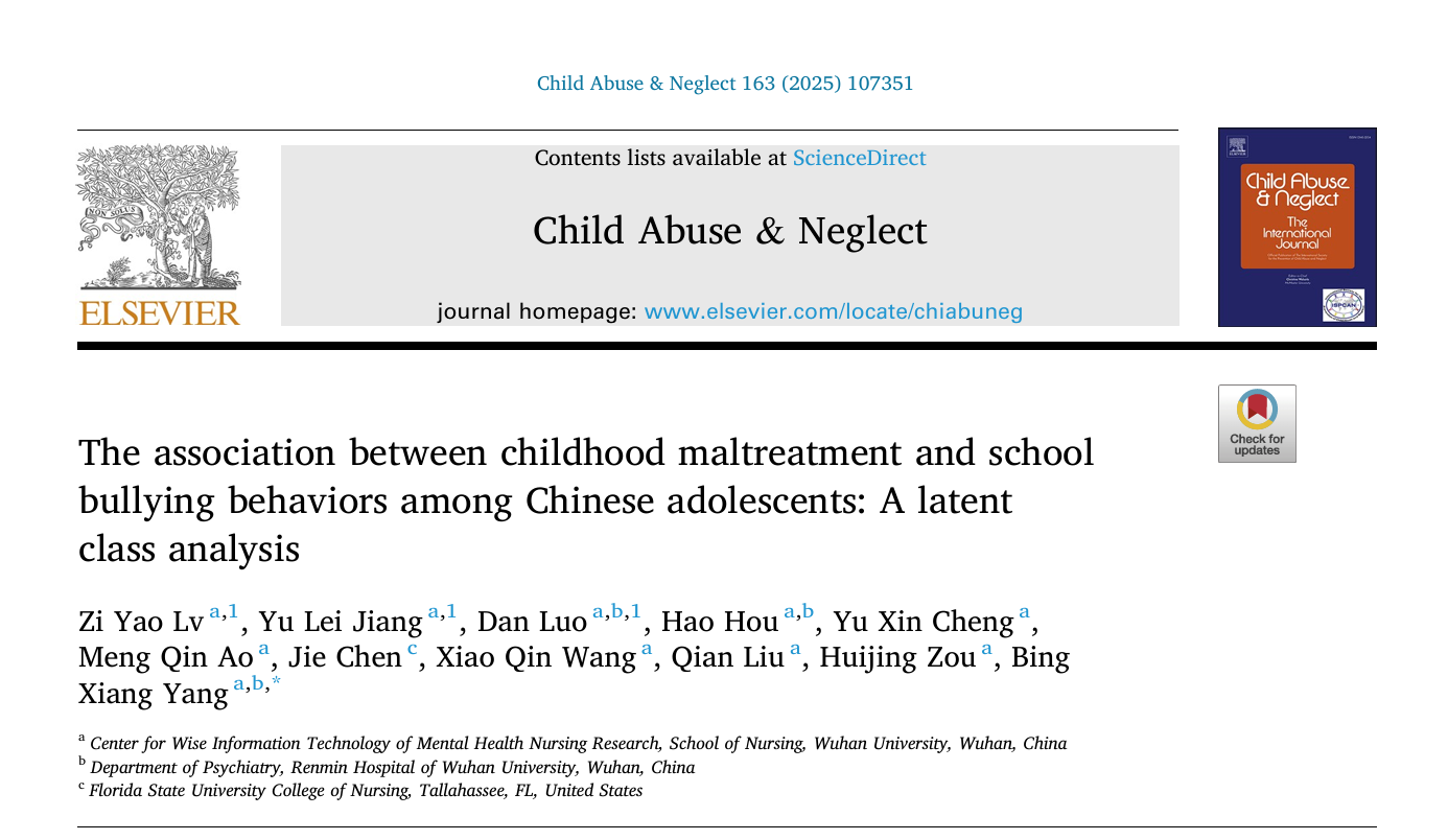(通讯员:吕紫瑶)近日,中心研究生吕紫瑶在国际期刊《Child Abuse & Neglect》(JCR一区;中科院二区;IF=3.4)上发表了题为“The association between childhood maltreatment and school bullying behaviors among Chinese adolescents: A latent class analysis”的研究论文。17c