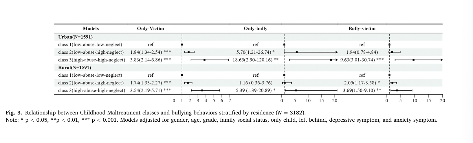 通过潜在类别分析,研究将青少年的童年期虐待分为三个亚组:class 1(低虐待低忽视)、class 2(低虐待高忽视)、class 3(高虐待高忽视)。与class 1相比,class 2和class 3都会增加青少年参与任一种欺凌角色的风险。采用倾向性评分匹配以平衡城乡样本间的基线差异,随后在匹配后的样本上开展了城乡分层分析。研究发现与城市青少年相比,农村地区主要经历忽视的青少年更有可能同时成为欺凌者和受害者。总的来说,本研究表明了青少年童年期虐待对欺凌行为具有显著影响,不同的虐待模式为欺凌行为风险分层提供了关键的见解。城乡差异进一步调节了这些关联。针对欺凌行为的干预策略可以考虑虐待模式和城乡差距等因素,以提高干预的针对性和有效性。