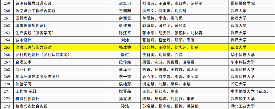 杨冰香教授负责(团队成员:邹会静、王晓琴、刘忠纯、刘茜)的《健康心理与压力应对》课程成功入选,获评“国家级一流本科课程(社会实践一流课程)”。这是17c