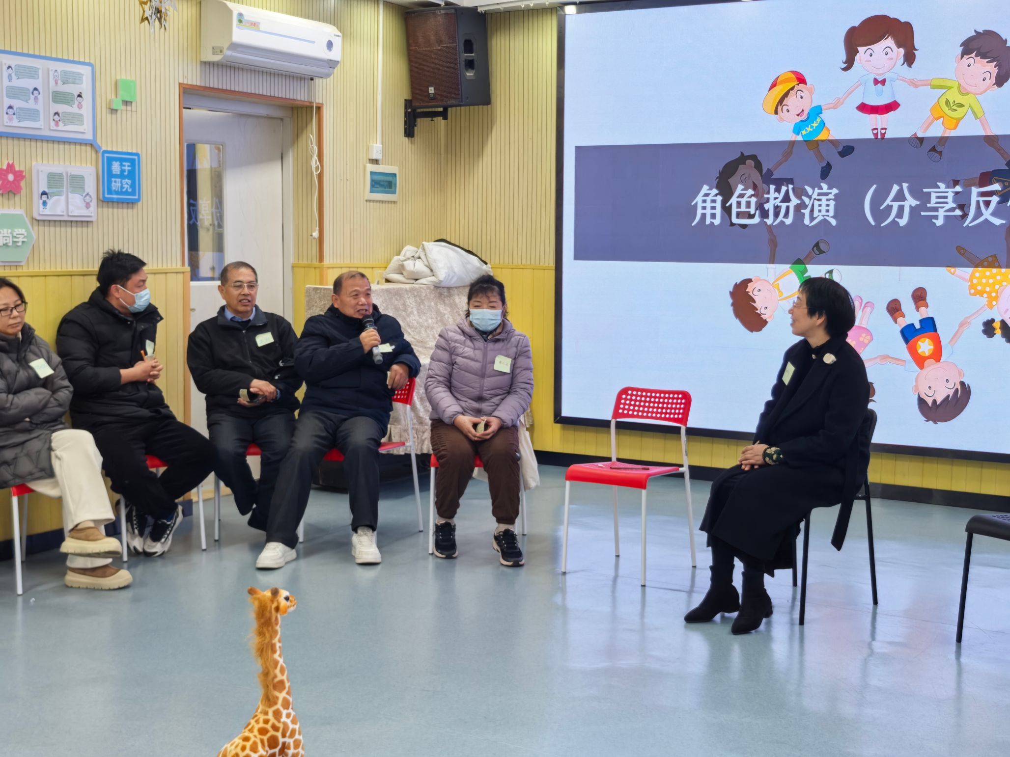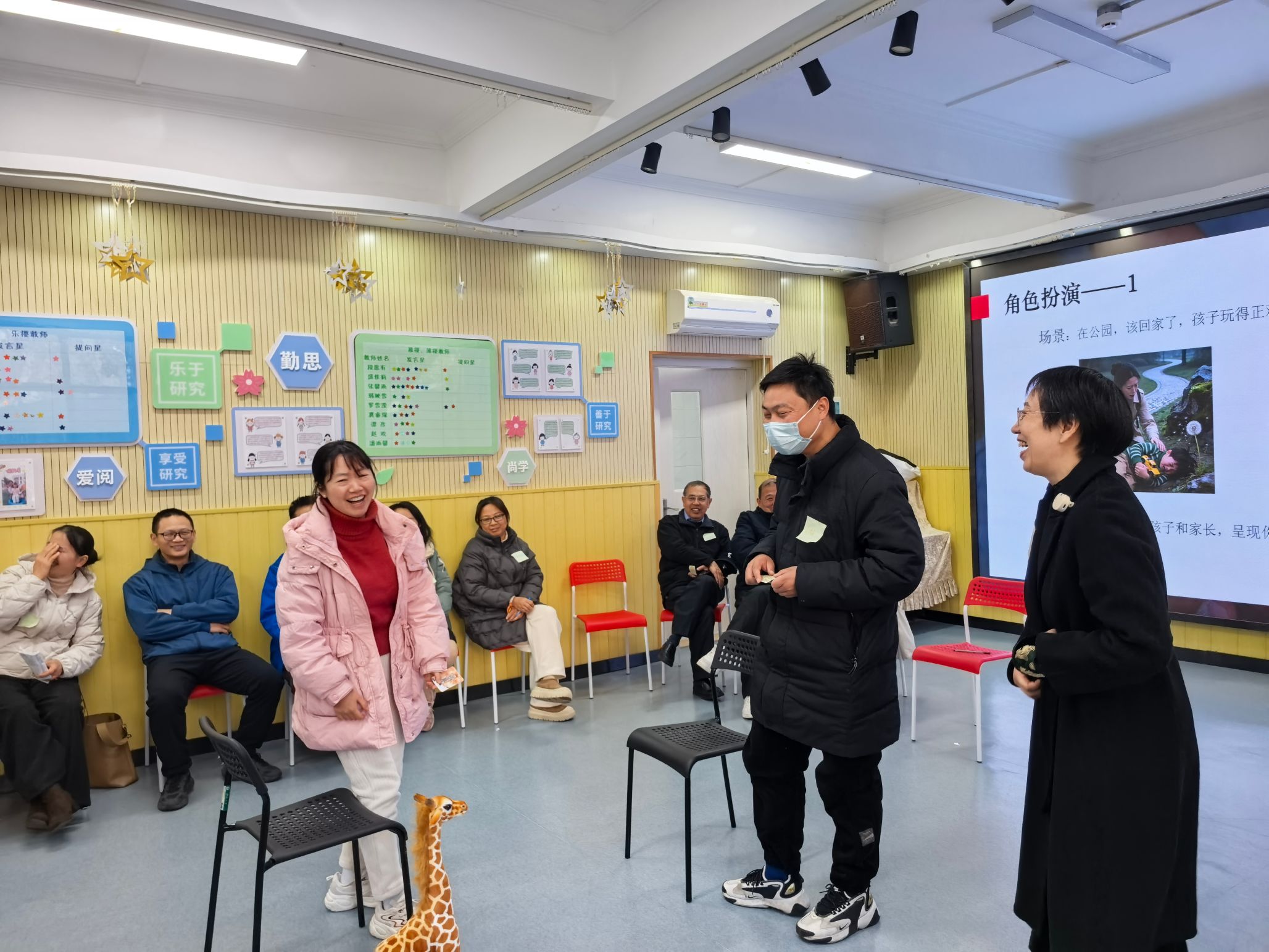 情景演练环节将活动推向高潮。家长们分组围绕“公园回家时孩子哭闹躺地”的场景展开角色扮演:A组两位家长分别展现自己家庭中的等应对方式,B组运用“观察-感受-需要-请求”四步框架进行沟通。通过不同的示范,让家长们直观感受非暴力沟通的力量。分享环节中,扮演“孩子”的家长纷纷表示,理解与尊重的回应更能让人产生合作意愿,也更符合幼儿的情绪接纳需求。