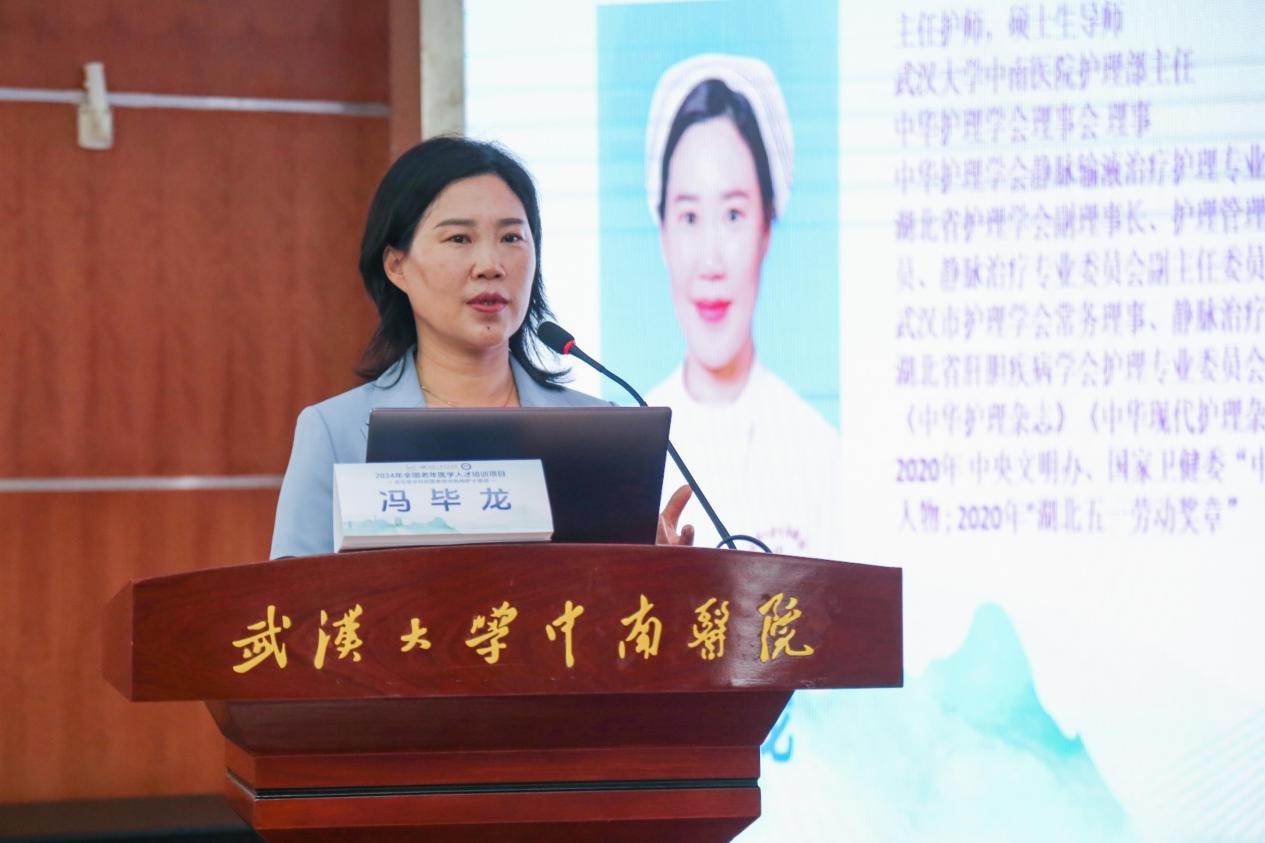中南医院护理部主任冯毕龙就老年护理人才的培养和护理能力的提升进行了精彩分享,期待参训学员通过此次培训切实提升技能,运用于老年护理工作。荆州市康养服务中心的李莉和国药葛洲坝中心医院的赵明玉作为学员代表发言,表达了全体学员对此次学习机会的珍视,并承诺将所学应用于实际工作中,助力老年护理事业。