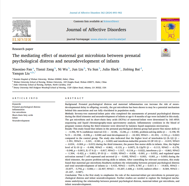 刘燕群课题组在《Journal of Affective Disorders》(中科院二区TOP,JCR一区)期刊上发表了题为“The mediating effect of maternal gut microbiota between prenatal psychological distress and neurodevelopment of infants(母亲肠道菌群在产前心理困扰与婴儿神经发育之间的中介效应)”的最新研究进展。近些年来,越来越多的学者开始关注到产前心理困扰和母体炎症,研究表明产前心理困扰和母体炎症可增加后代神经发育迟缓的风险,...